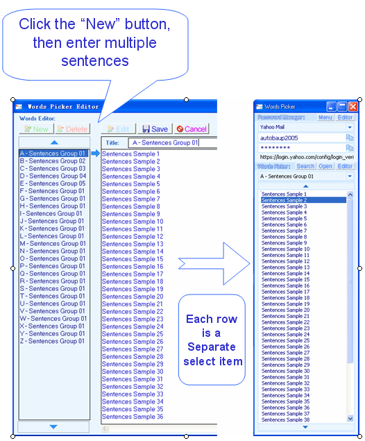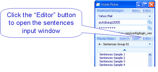 When you writing email, chat or writing other documents, you may be need to enter some same sentences frequency, Words Picker can free you from this tired work. Words Picker can stores multiple groups of sentences, and you can ease to find the sentence you need from a docking window, copy and paste, or drag and drop the it to the email, chat, work process program. Words Picker attached the encryption feature, if you need, you can use it to store your web login name or password.